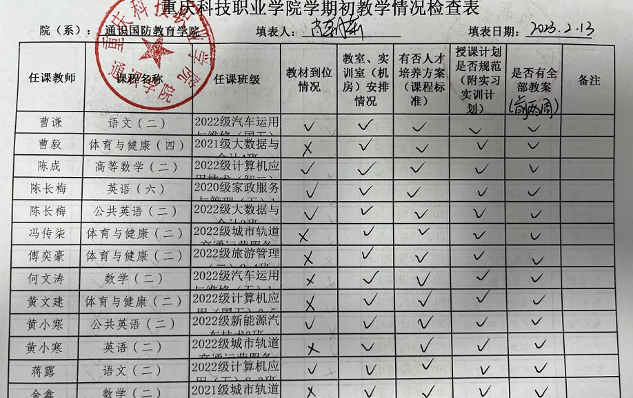 2023年2月12日前,全体专任教师提交本学期课程前两周教学资料至教研室,并将检查情况汇总形成通识国防教育学院学院期初教学资料检查汇总表。检查情况总体较好。本期35门课程资料和61位专职教师教学资料良好。对存在的教学资料模板不符合要求及资料有缺少的,将在教学督导过程中重点跟进,及时整改到位。
