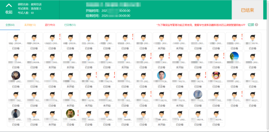 学生使用移动设备作答过程中发生切屏行为,教师监考界面会有提示(切屏学生头像变红并持续闪烁30秒,并且头像显示切屏二字提示,闪烁结束后学生头像右上角有感叹号标记,代表该学生进行过切屏的操作)