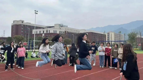 3.跳长绳:荡起长绳,同学们在绳中穿梭跳跃,展现出良好意志品质,增进了集体荣誉良好氛围。舞动的绳子像彩环似的飞扬,汗水浸湿着同学们的头发,她们脸上洋溢着青春的笑容。